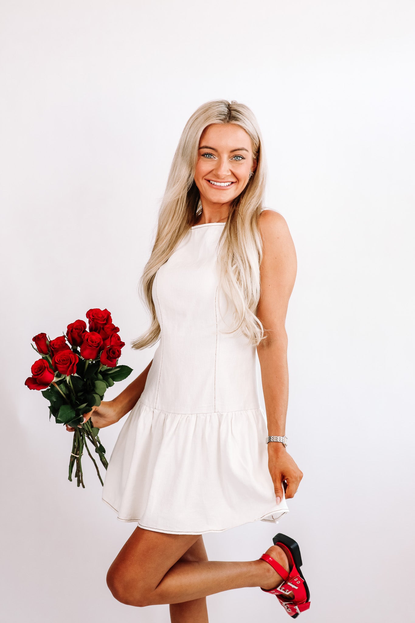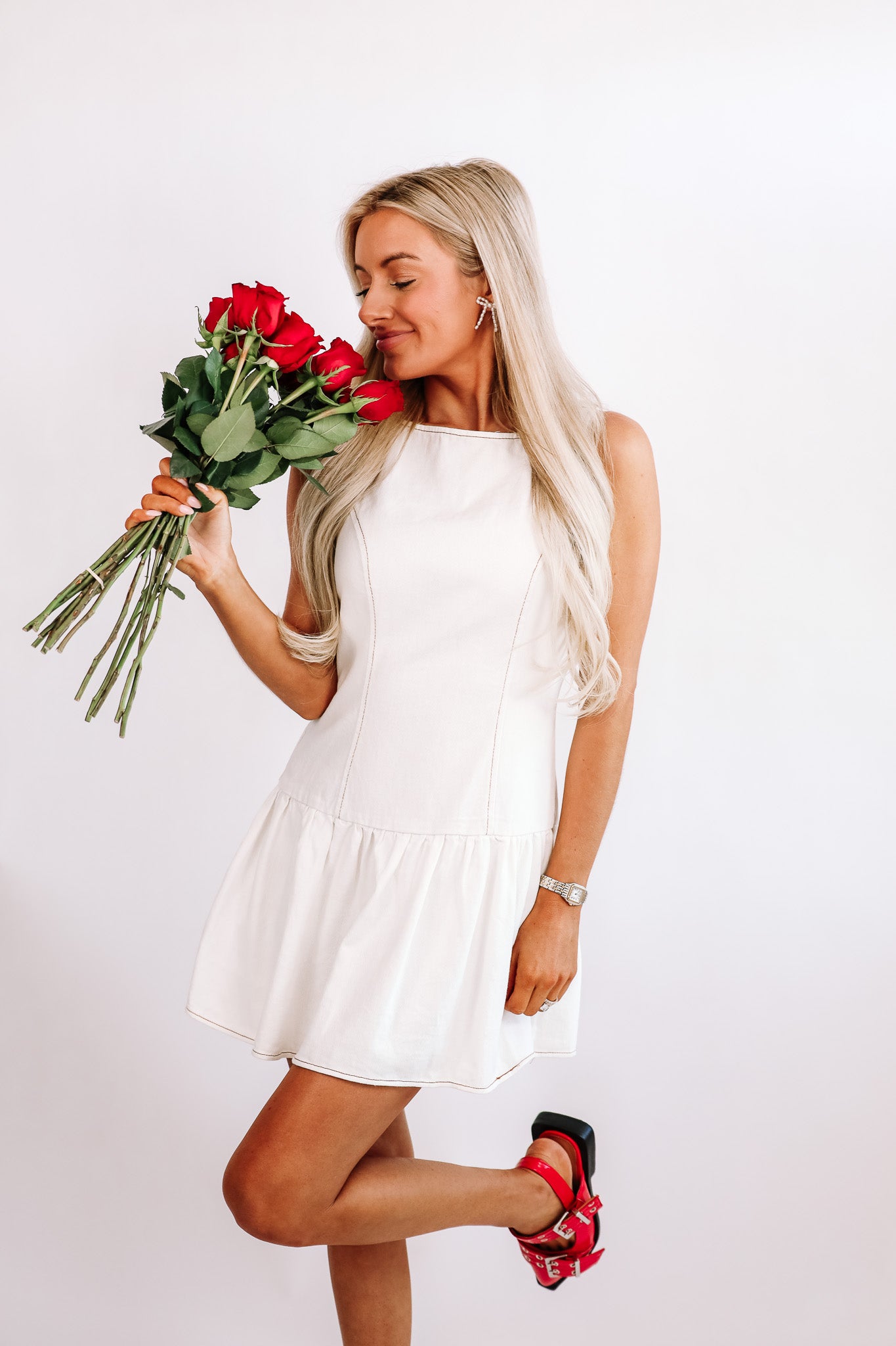 Introducing our Darlin Denim Dress in white! It features boat neckline, low waist line and ruffle detailed skirt. The sleeveless look makes it a perfect spring transition piece.