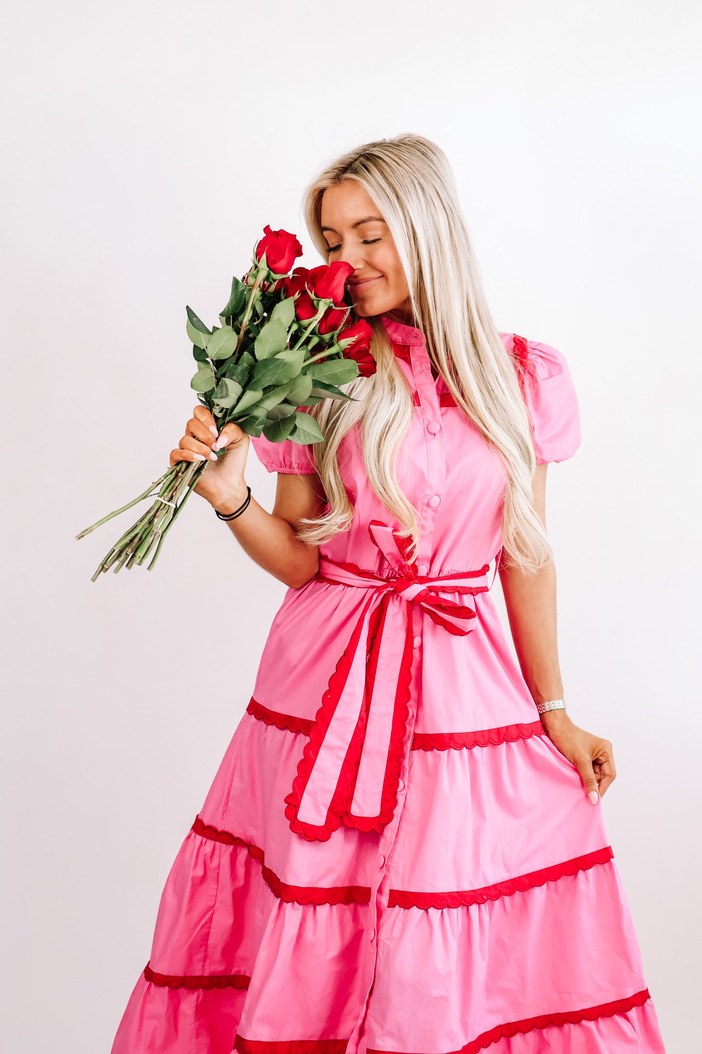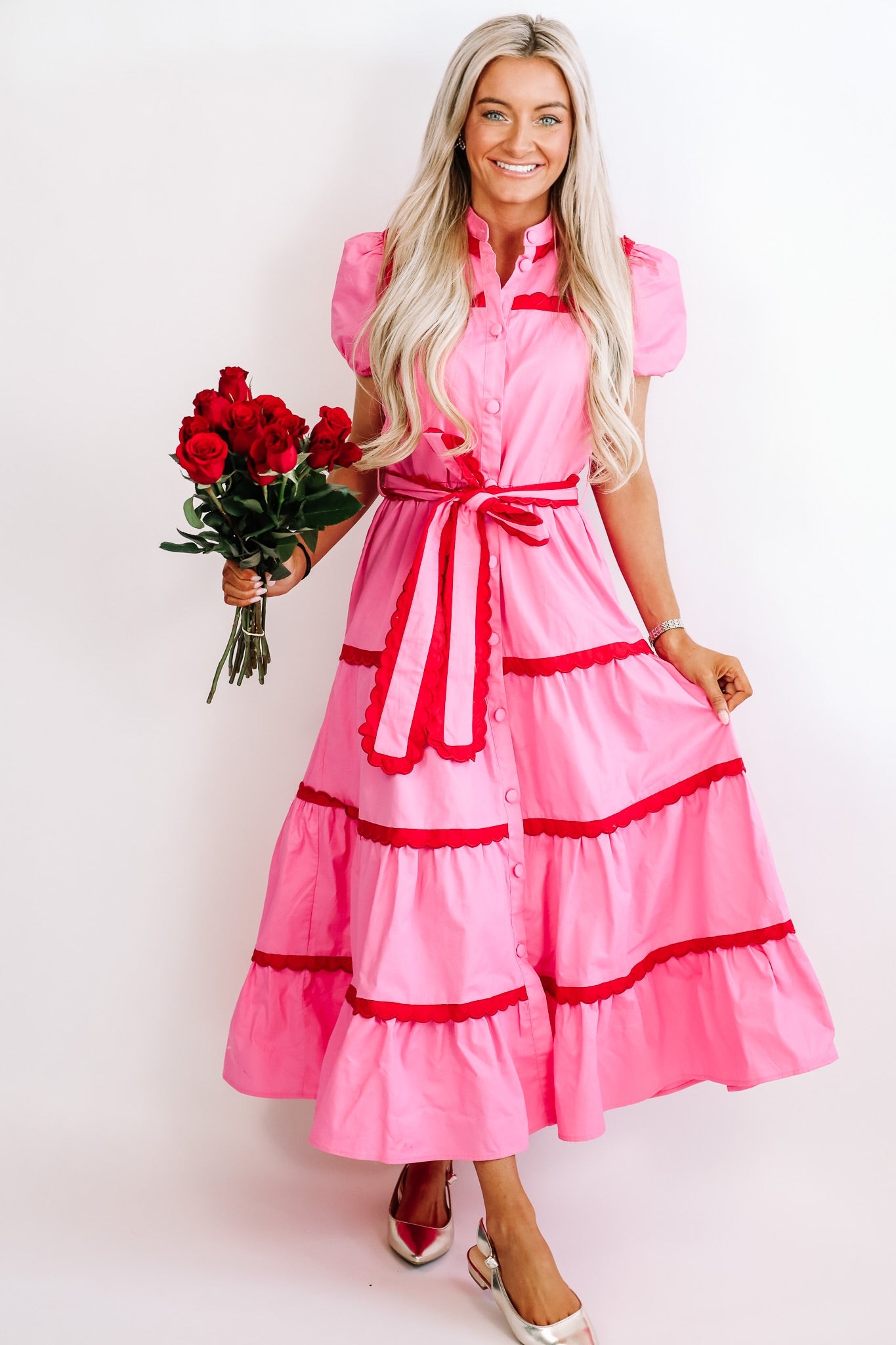 Our Cupid midi dress features tiered scalloped detail, button closure, short puff sleeves and a detachable bow waist tie.