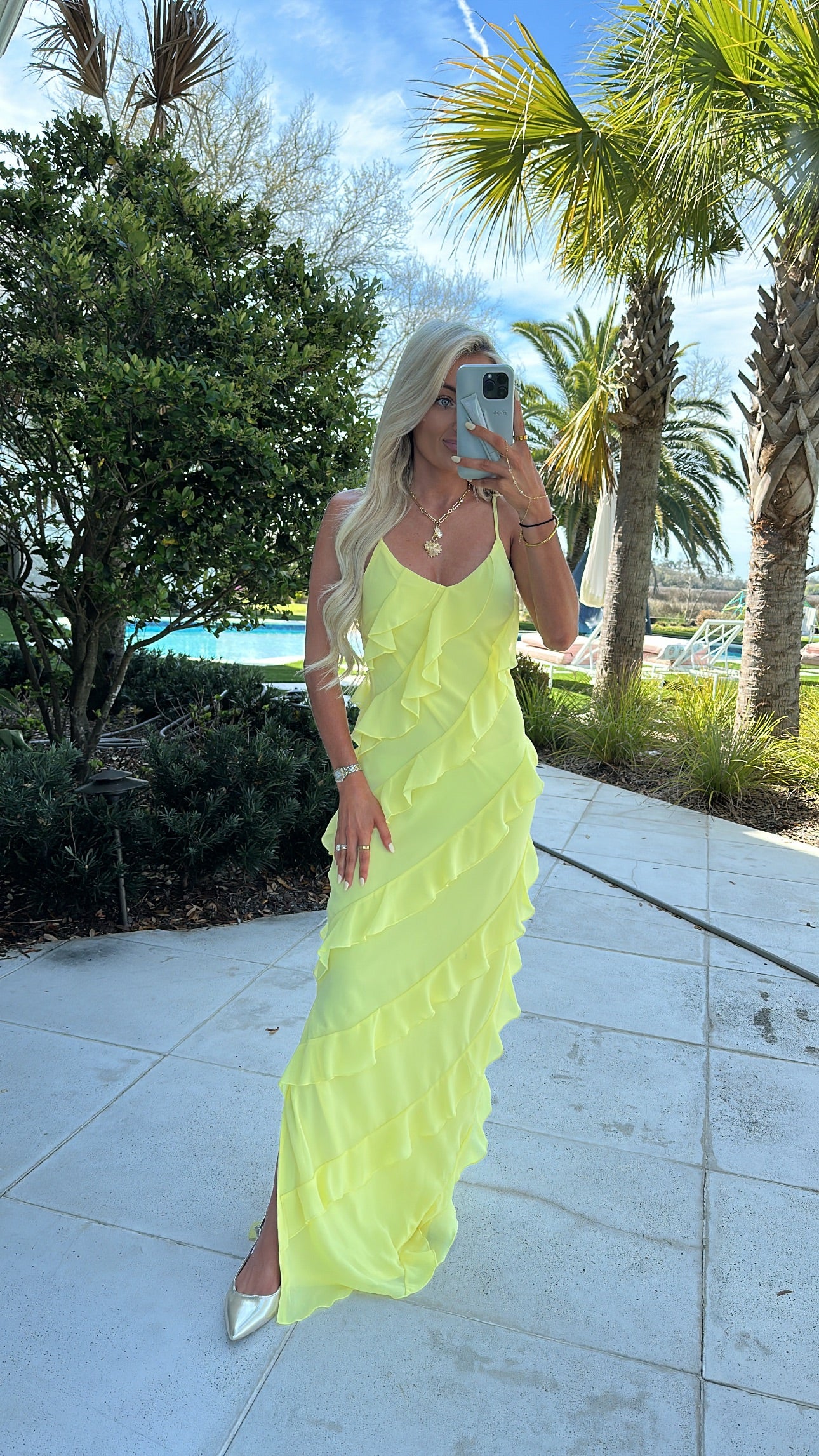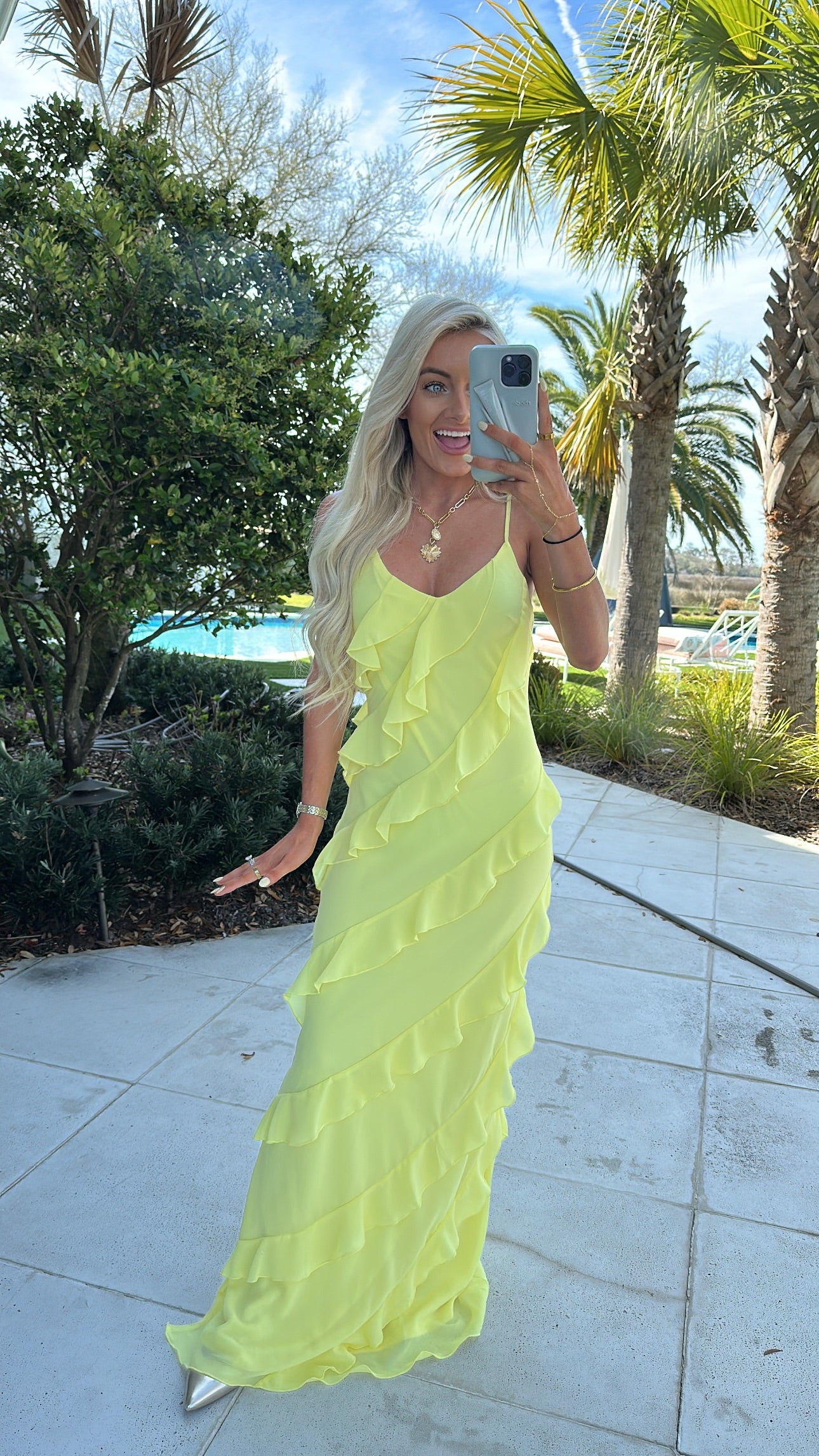 Introducing our Ashtin Midi Dress! This dress’s features an asymetrical, tiered design with ruffle details. The adjustable straps and lining underneath makes for a comfortable fit.