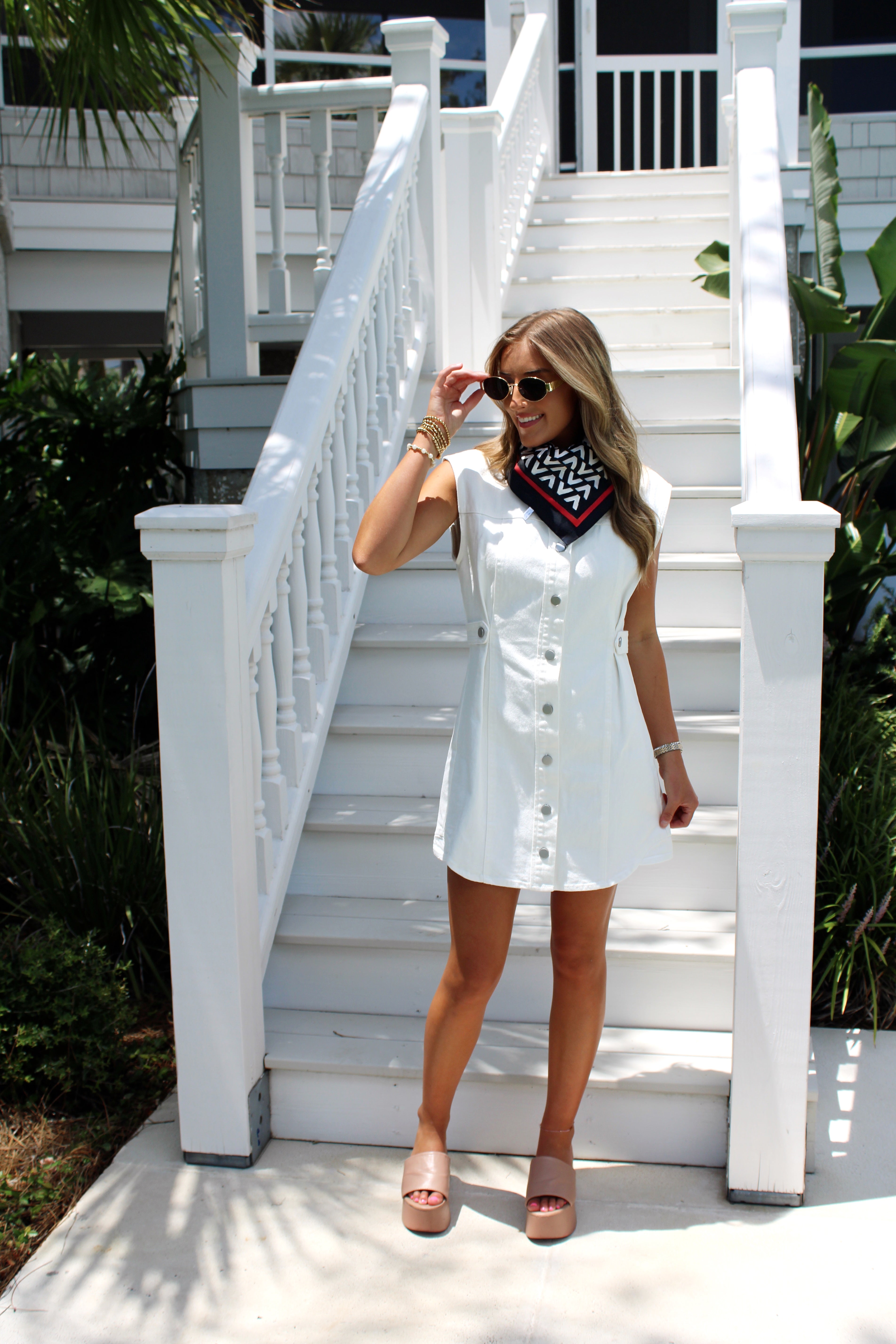 • white denim sleeveless dress featuring a button-up front and adjustable waist tabs for a flattering cinched fit