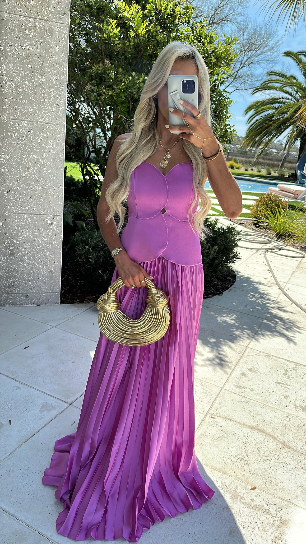 Introducing our Ellington Maxi Dress! It features a pleated style with a tie back. This dress is absolutely stunning and perfect to wear as a wedding guest dress!