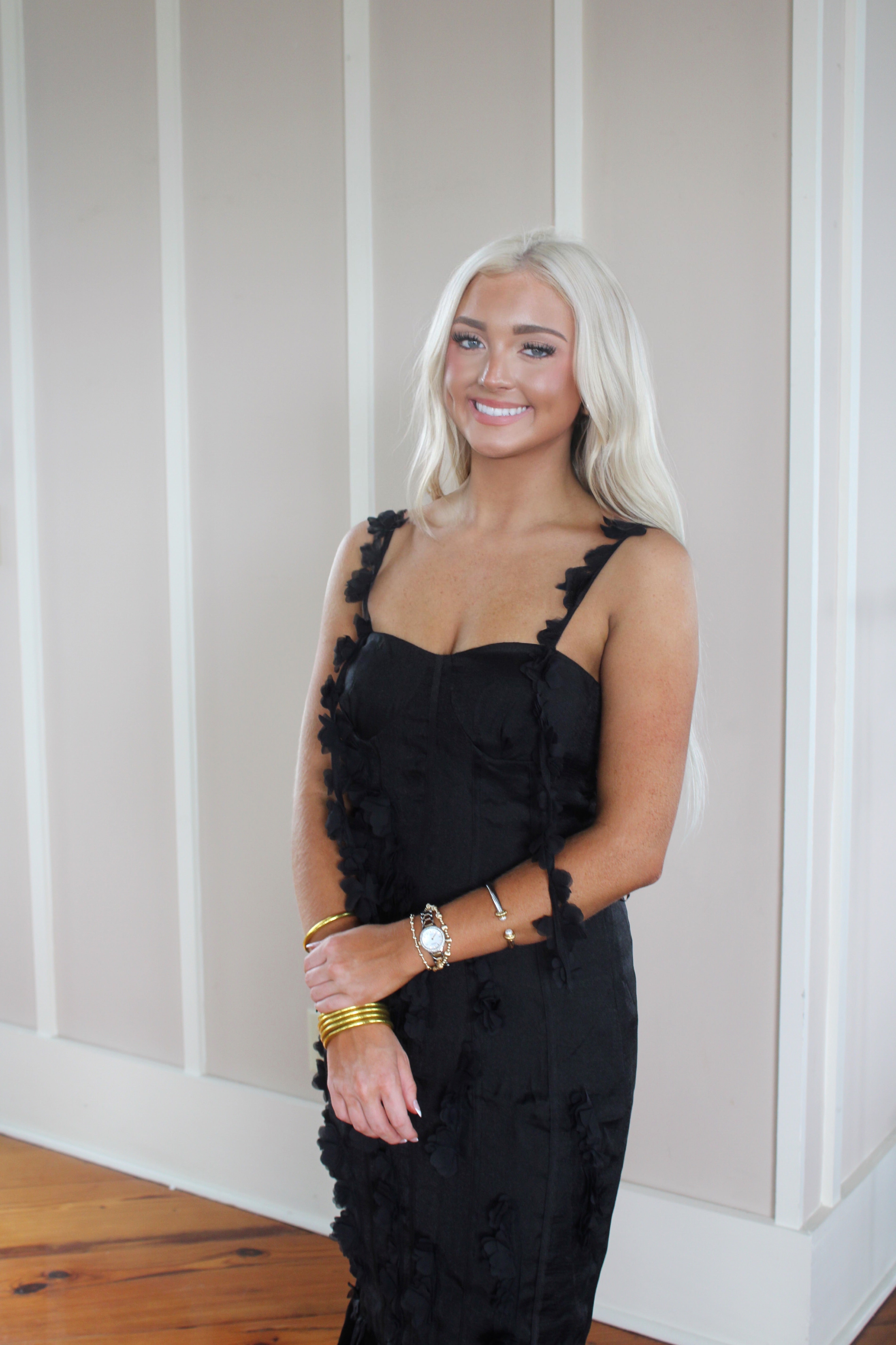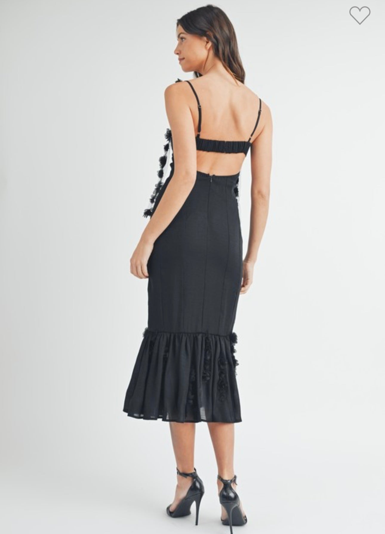 introducing our Marilyn Midi Dress. It features adjustable spaghetti straps, a curve enhancing bustier top with floral applique details.