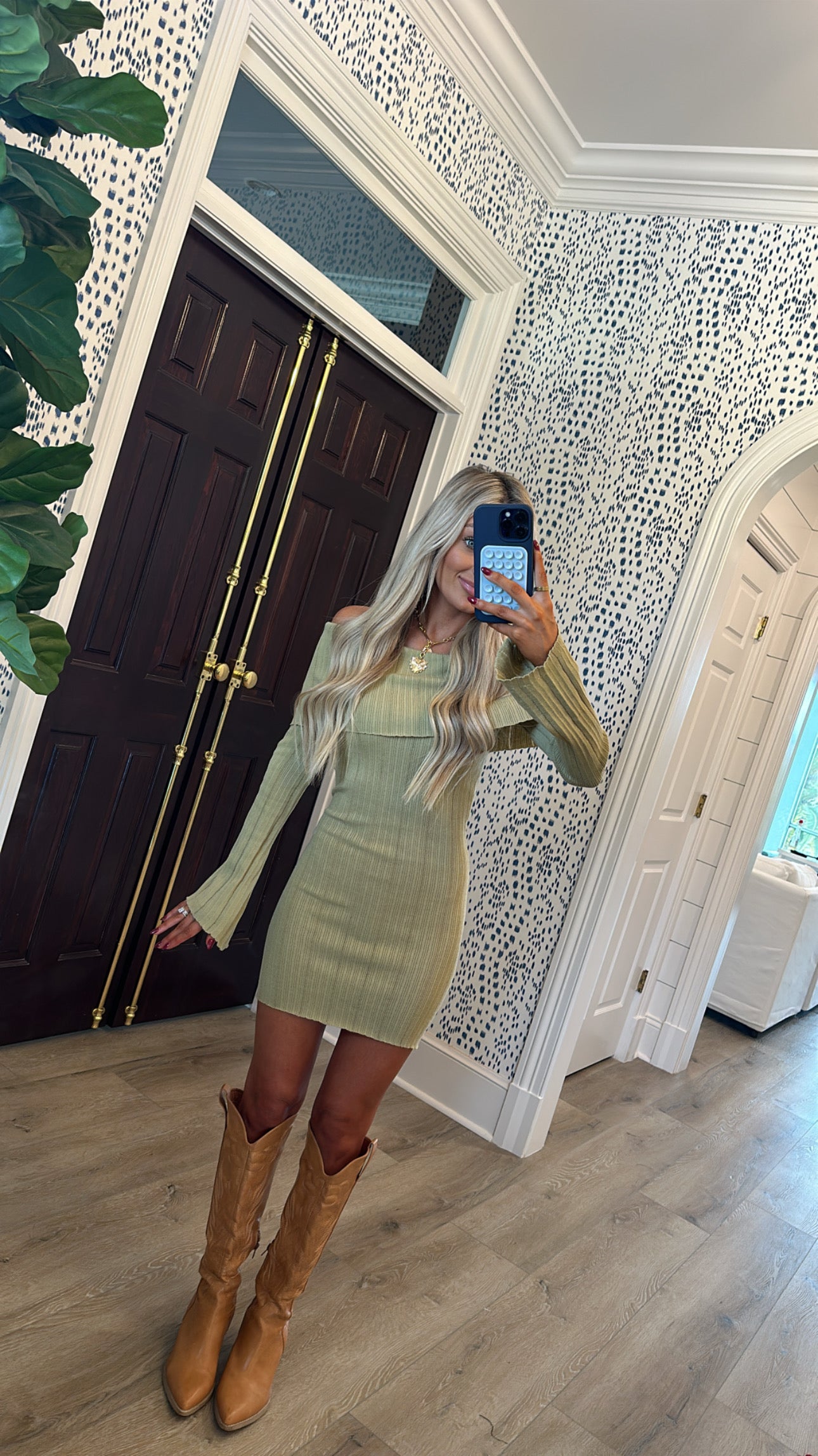 Our Matcha mini dress is the perfect olive green. It features off the shoulder straps and light flare sleeves. The light weight sweater material is perfect for warmer fall days!