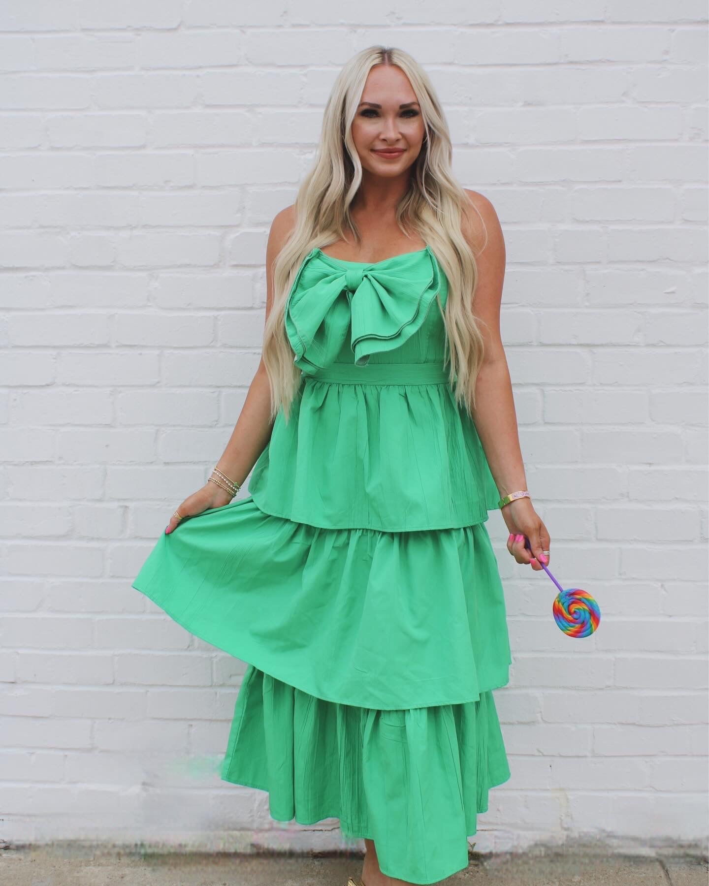 Our Meredith Midi dress has a tiered ruffle design with a bow on the bust! It features adjustable spaghetti straps, a smocked back and a concealed back zipper!