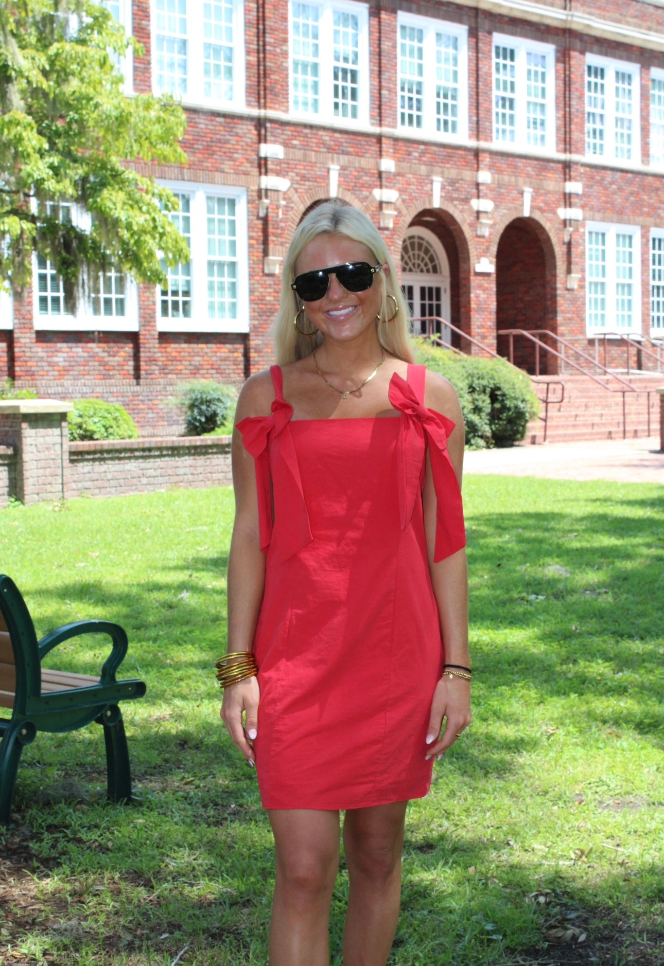 Our Rory Bow mini dress features wide straps with front bow detailing and concealed back zipper closing! As always, the bow detail adds a touch of feminine sophistication!