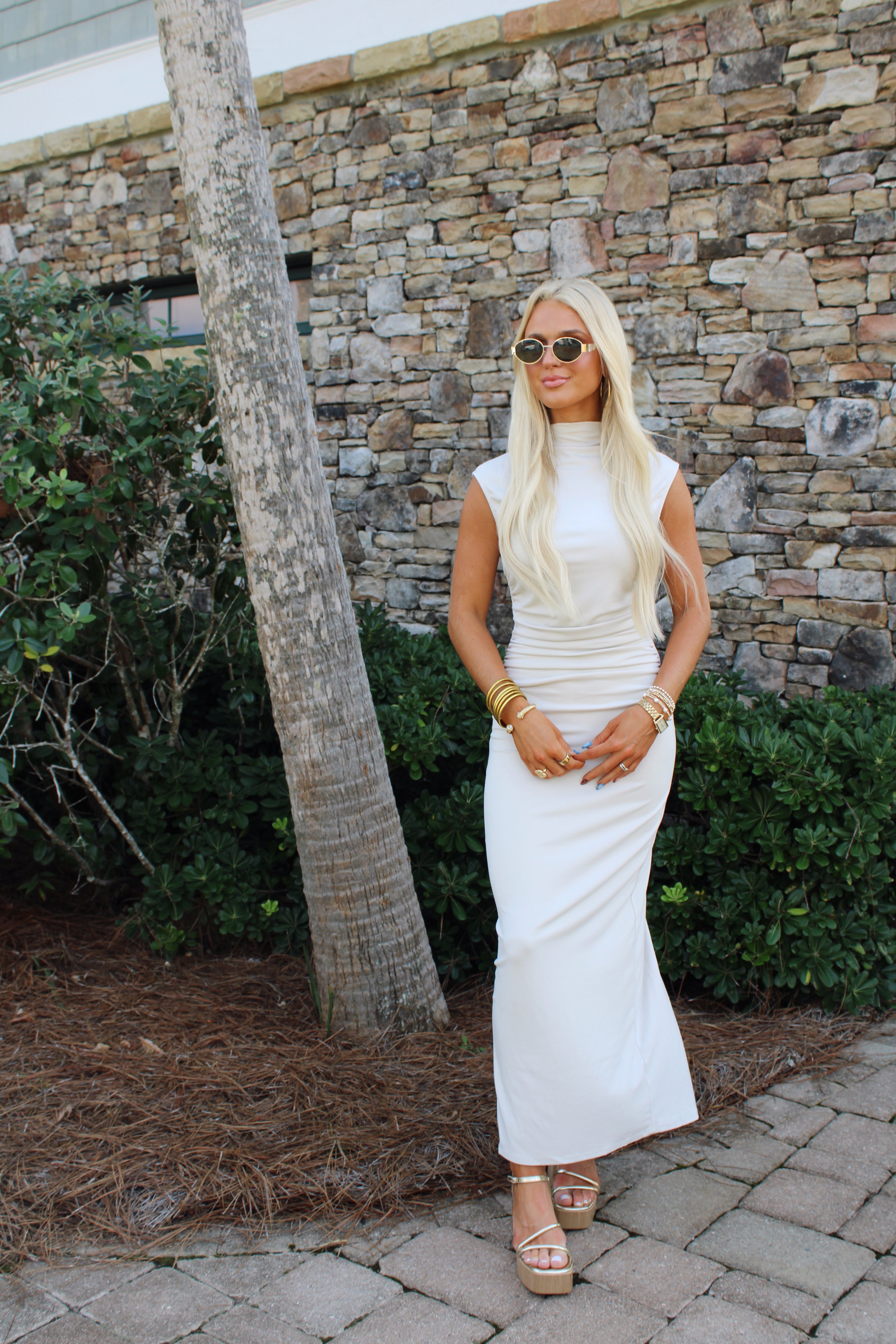 Introducing a sophisticated and minimalist waist ruched back slit maxi dress, featuring a chic mock neckline and delicate micro cap sleeves. The dress is designed with a ruched side to accentuate and flatter the figure, while the ankle length and back split add a touch of elegance and allure.