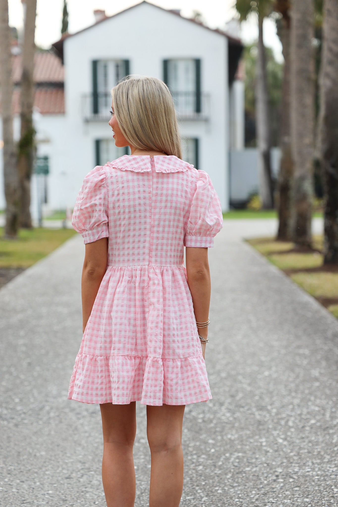 Our Gabriella Gingham Dress features puff sleeves and hidden snap buttons. The Peter Pan collar adds a touch of sophistication and the back zipper allows for easy dress.