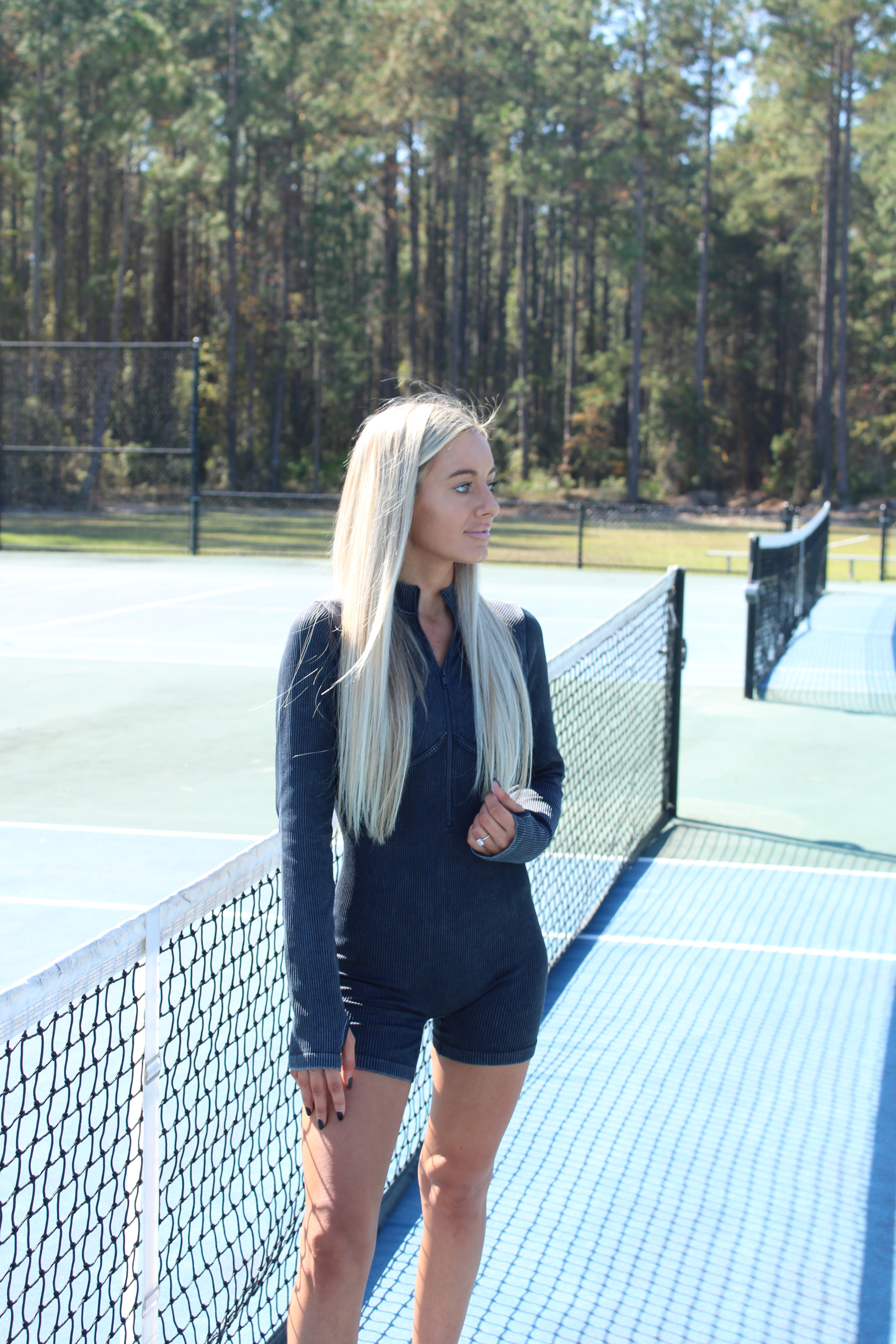 • Our Mineral wash, seamless, mock neck romper is a go to fit for all things athletic and comfy!