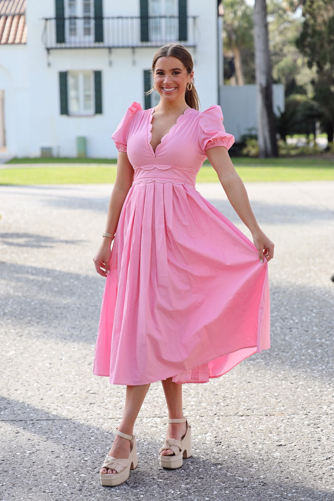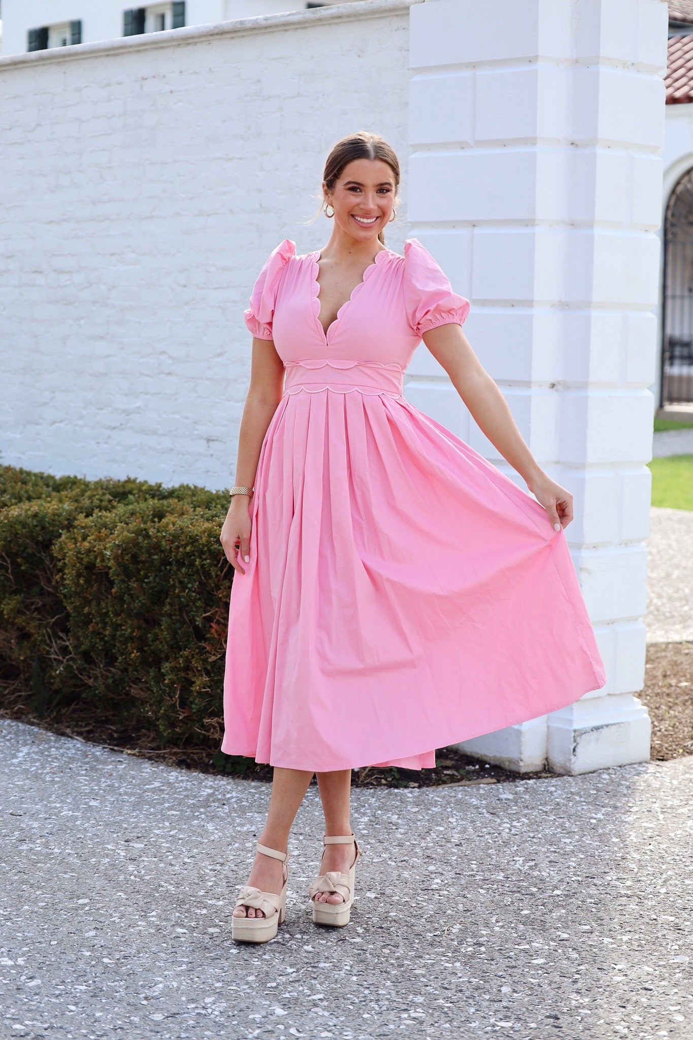 Introducing our Spinola Scallop Midi Dress! This dress features a v- neckline with scallop detail, short puff sleeves, a belted waist & a concealed back zipper!