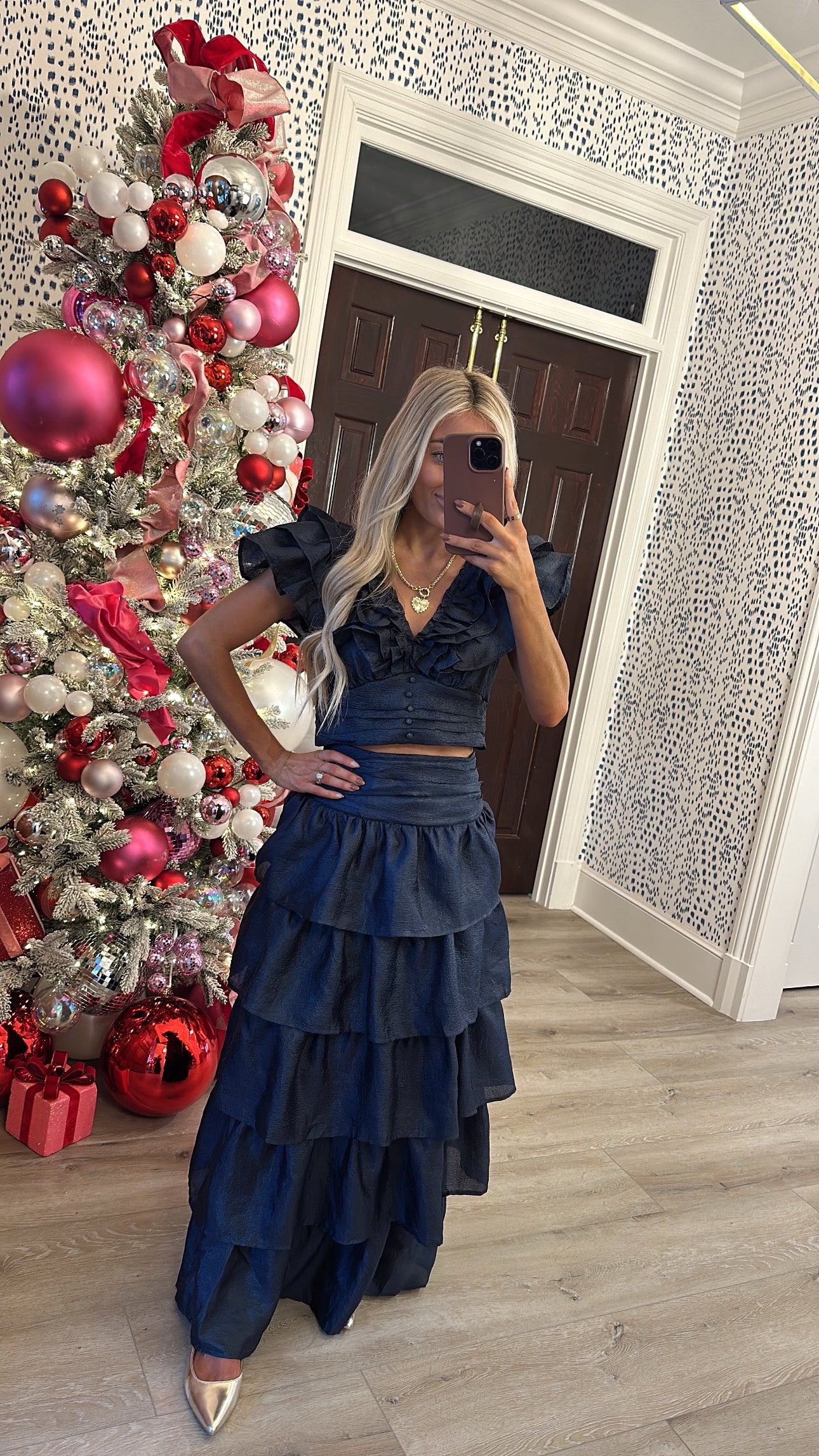 Introducing our Champagne Toast Skirt Set. This set features a ruffled detail crop top with faux button accents and back zip closure. The skirt is enhanced with layered, ruffle trim detailing.