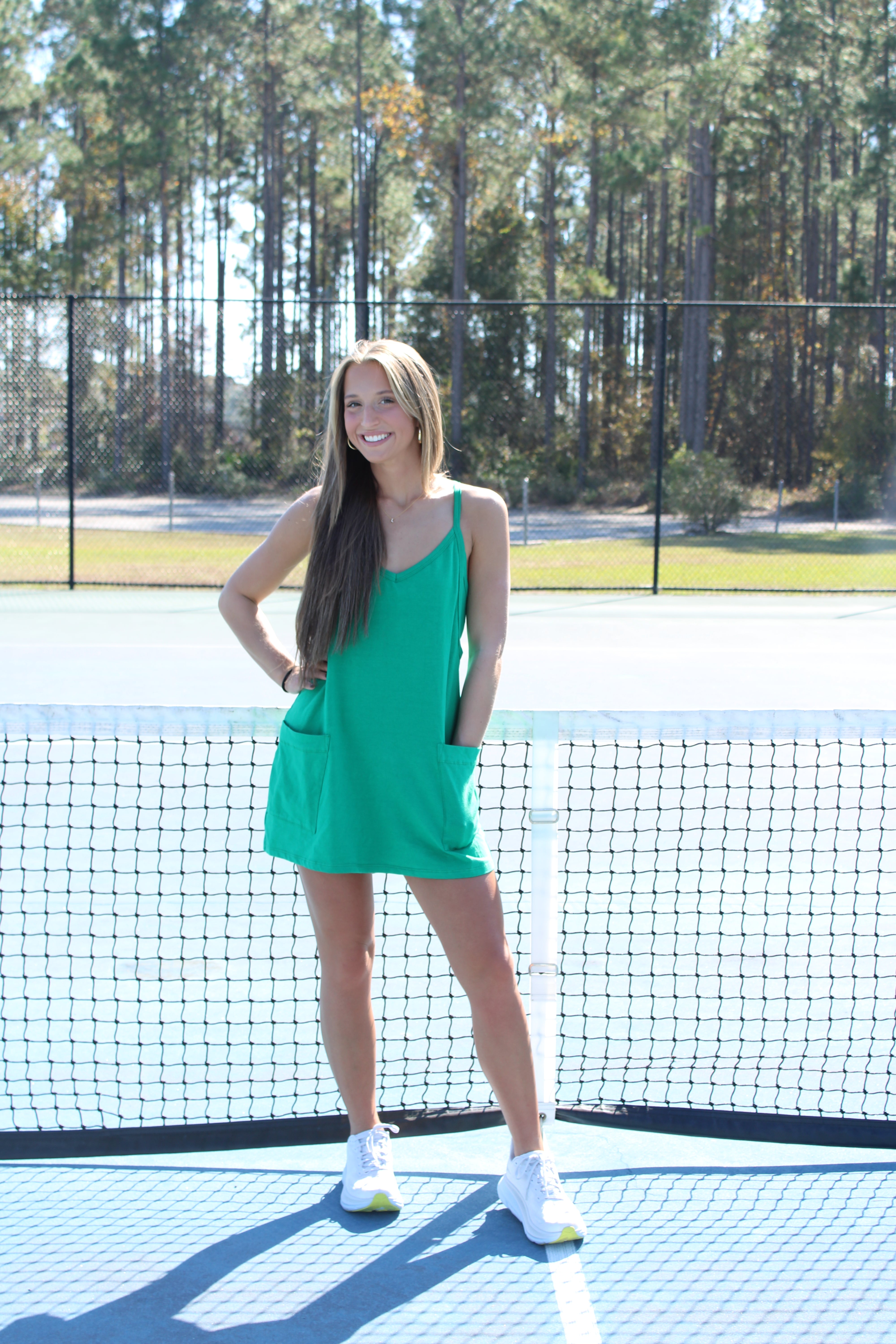 • Kelly Green Poppy Pocketed Mini Dress. Front pocket accents, non-adjustable straps, and built in shorts, perfect comfort fit!