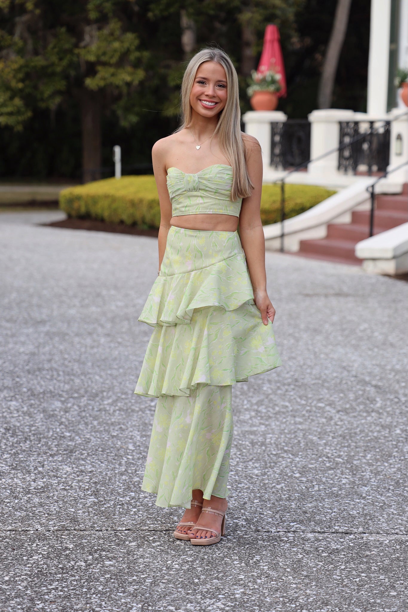 Introducing our Billini Skirt set. This set features a crop top and tiered midi skirt. The yellow floral design adds a touch of elegance and sophistication. This set is perfect for both spring and summer!