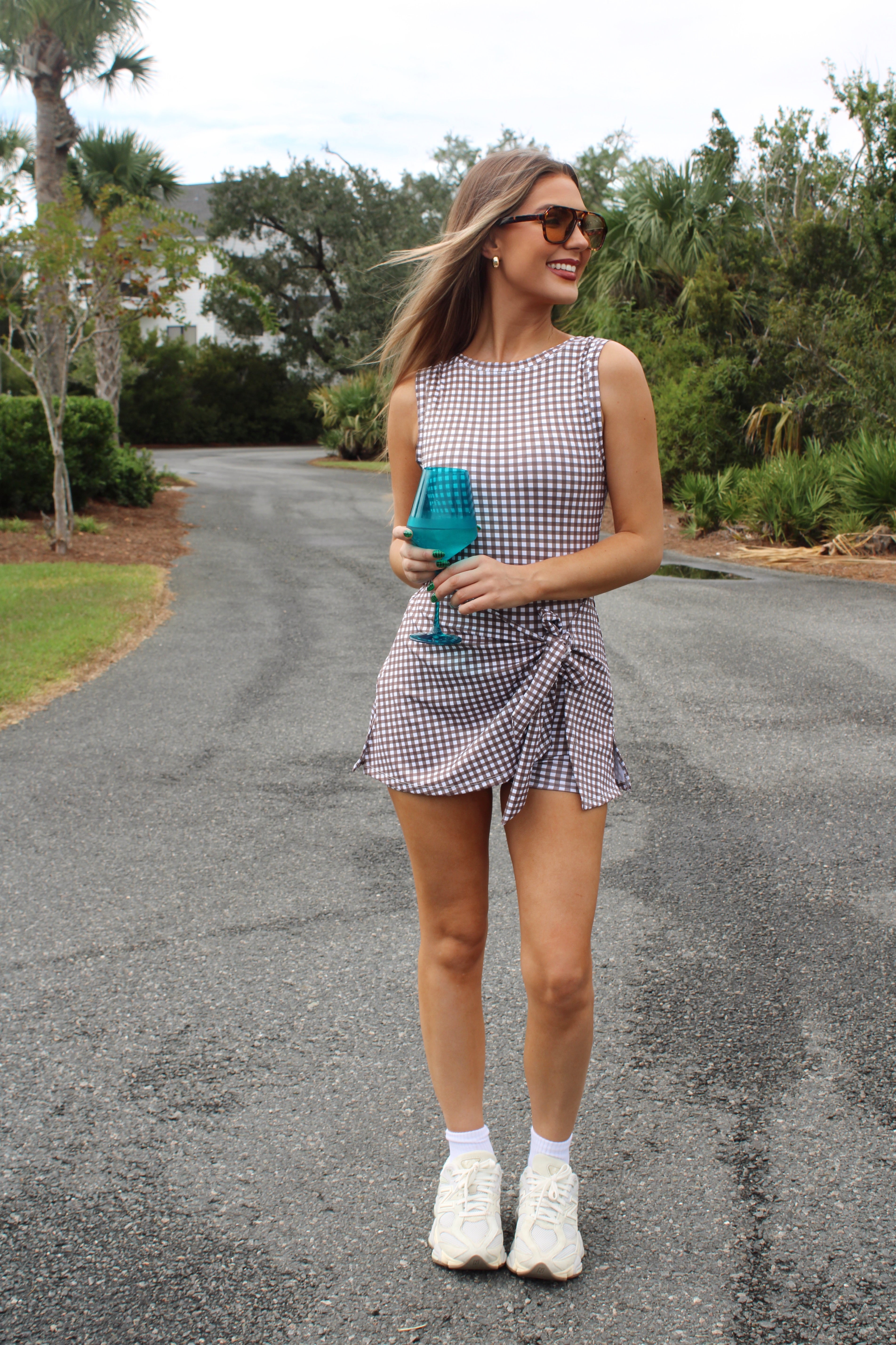 We’re bringing back our customers favorite wrap tie active dress in bubble gum pink, gingham! It features built in shorts and a side tie closure. The moisture- wicking material makes this active dress easy to wear on the go!