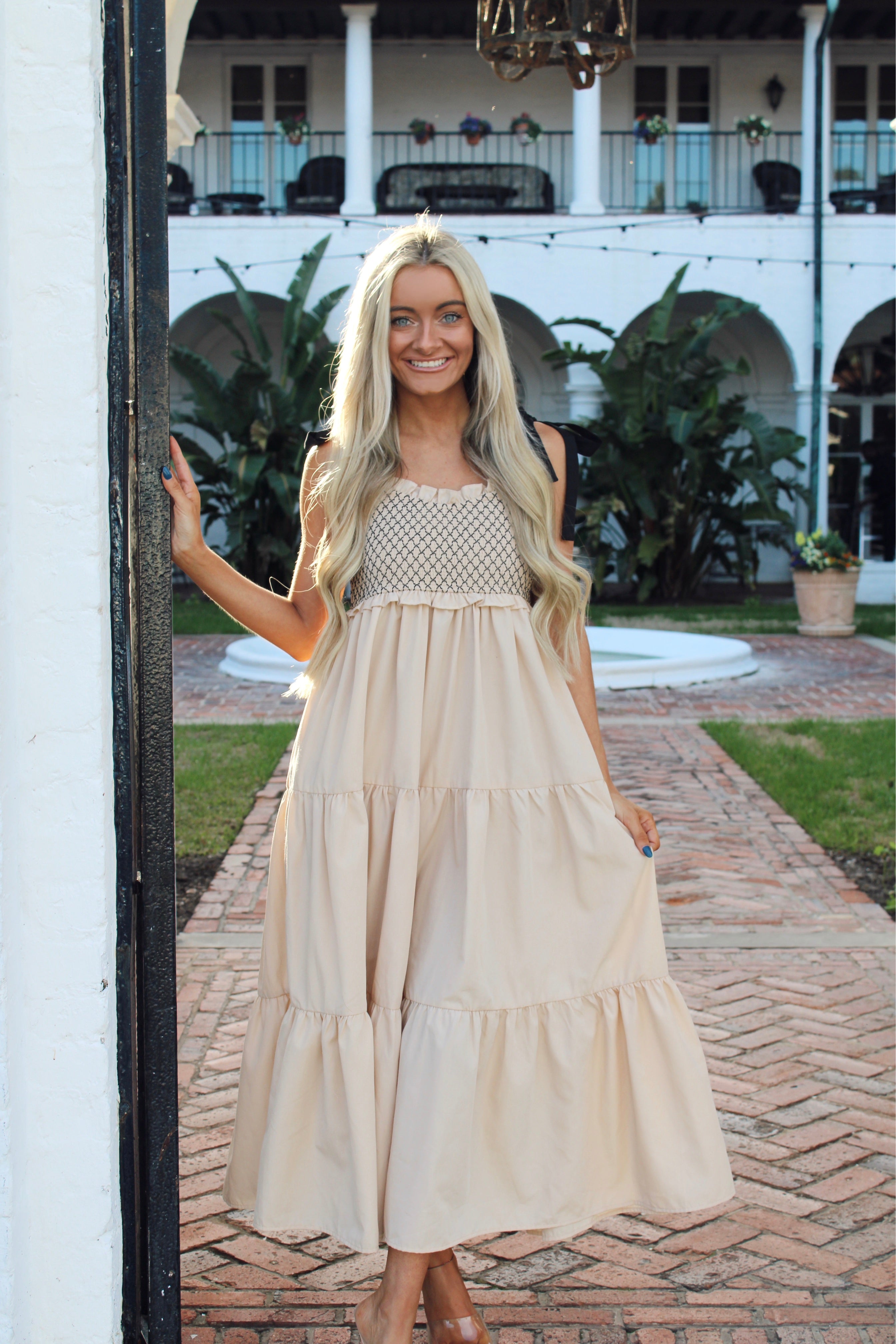 Our Ollie Maxi Dress features a ruffle detail neck line, adjustable ribbon tie straps and in seam pockets! This is for the neutral girlies!