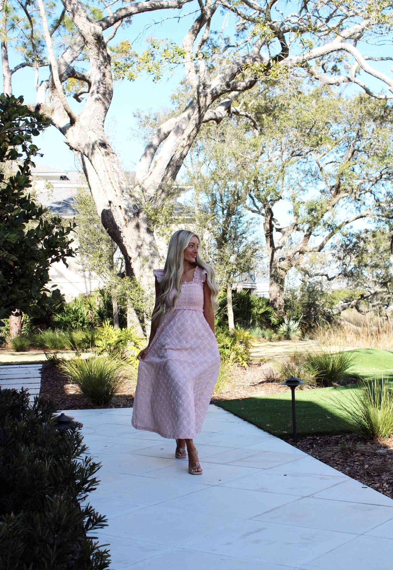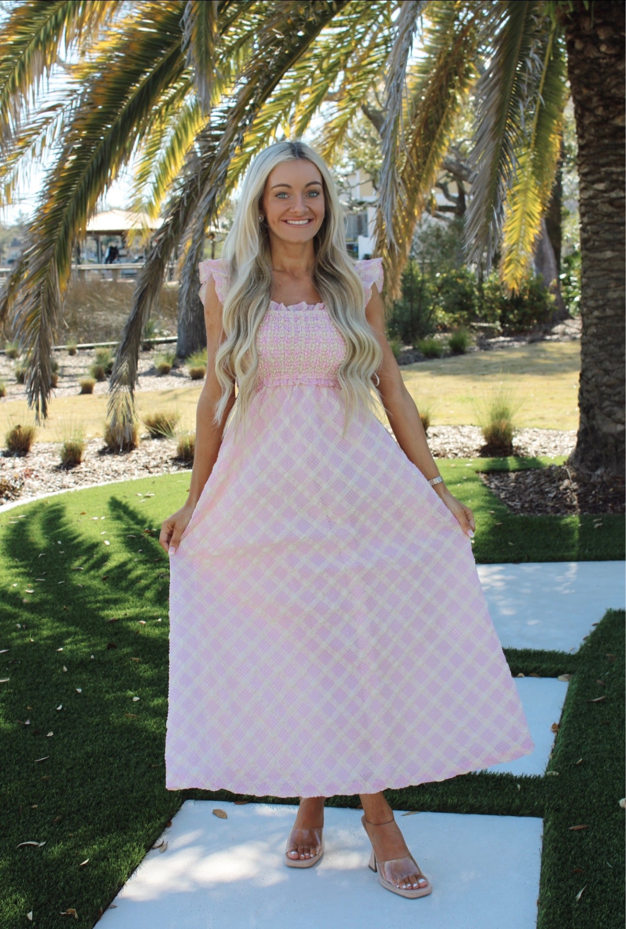Our Quinn Midi Dress is a plaid seersucker pattern with a smocked top and sleeves. It features pink and yellow tones which give off the perfect girly vibe.