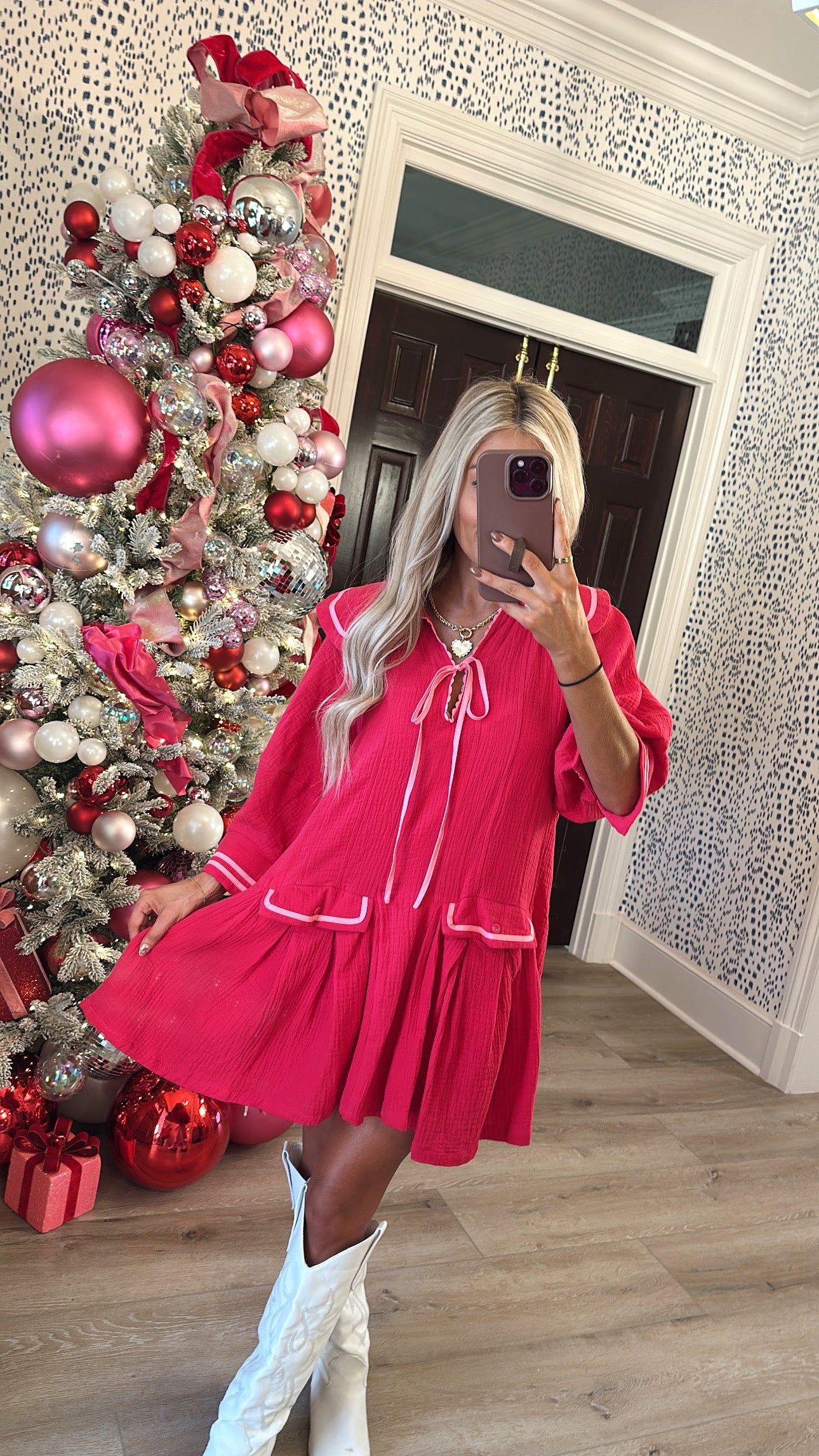 Introducing our Gumdrop Mini Dress. This dress features 3/4” sleeves, pleated skirt, sailor collar and side pockets! The pink & red combo is a must have!