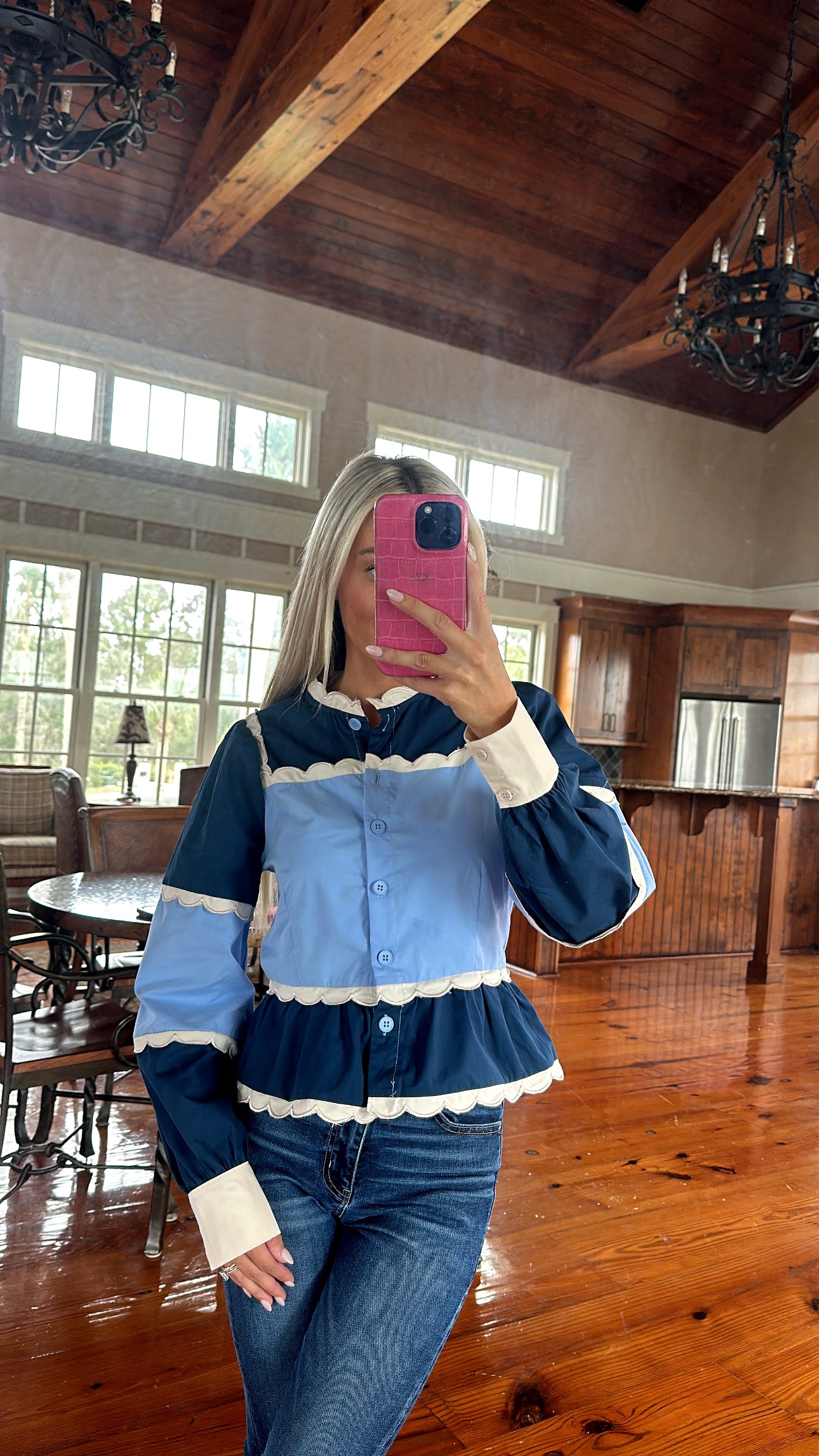 Introducing our James button up! This peplum top features color block detailing with accent contrast scalloped features! Navy gives us the old money aesthetic every girl is looking for.