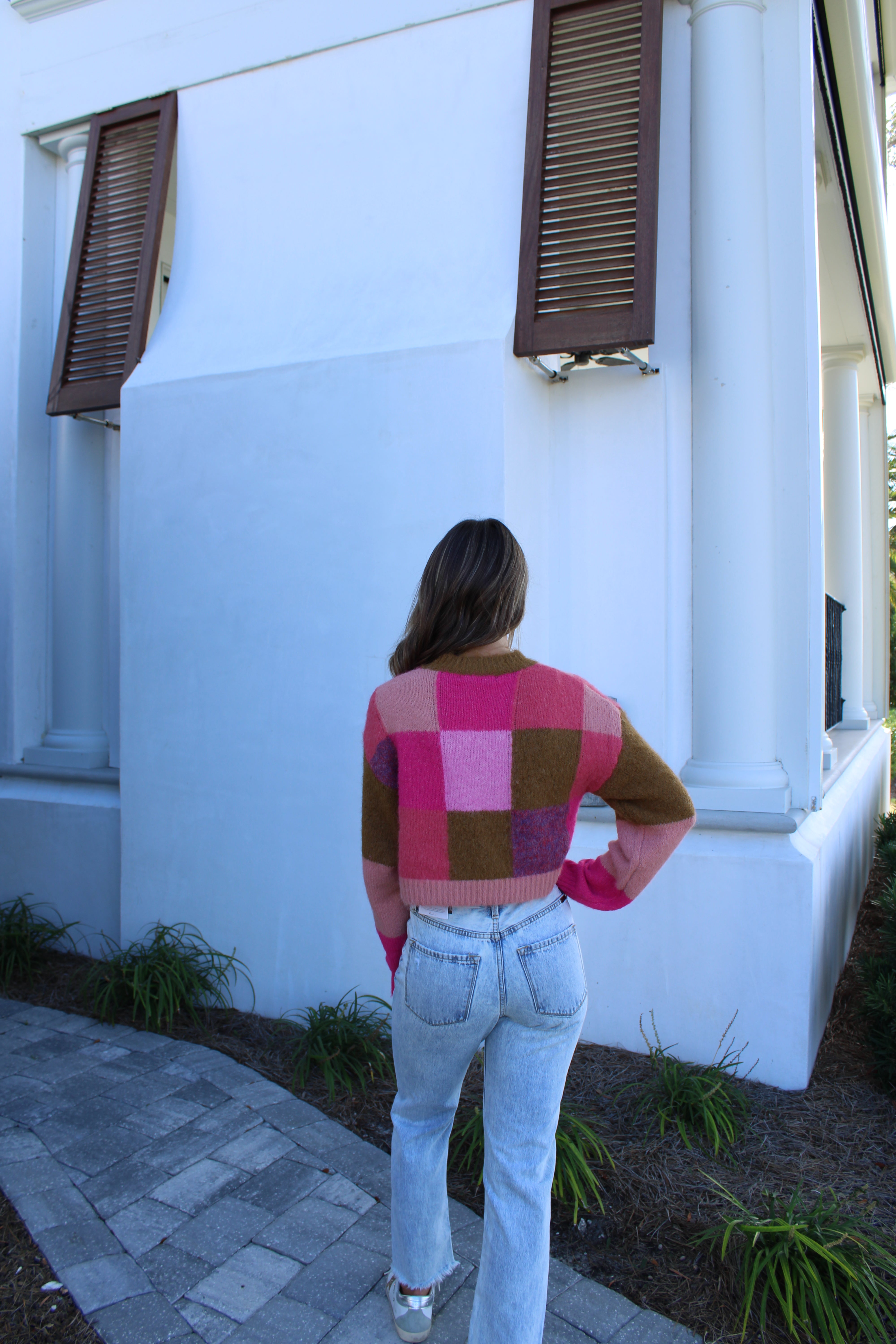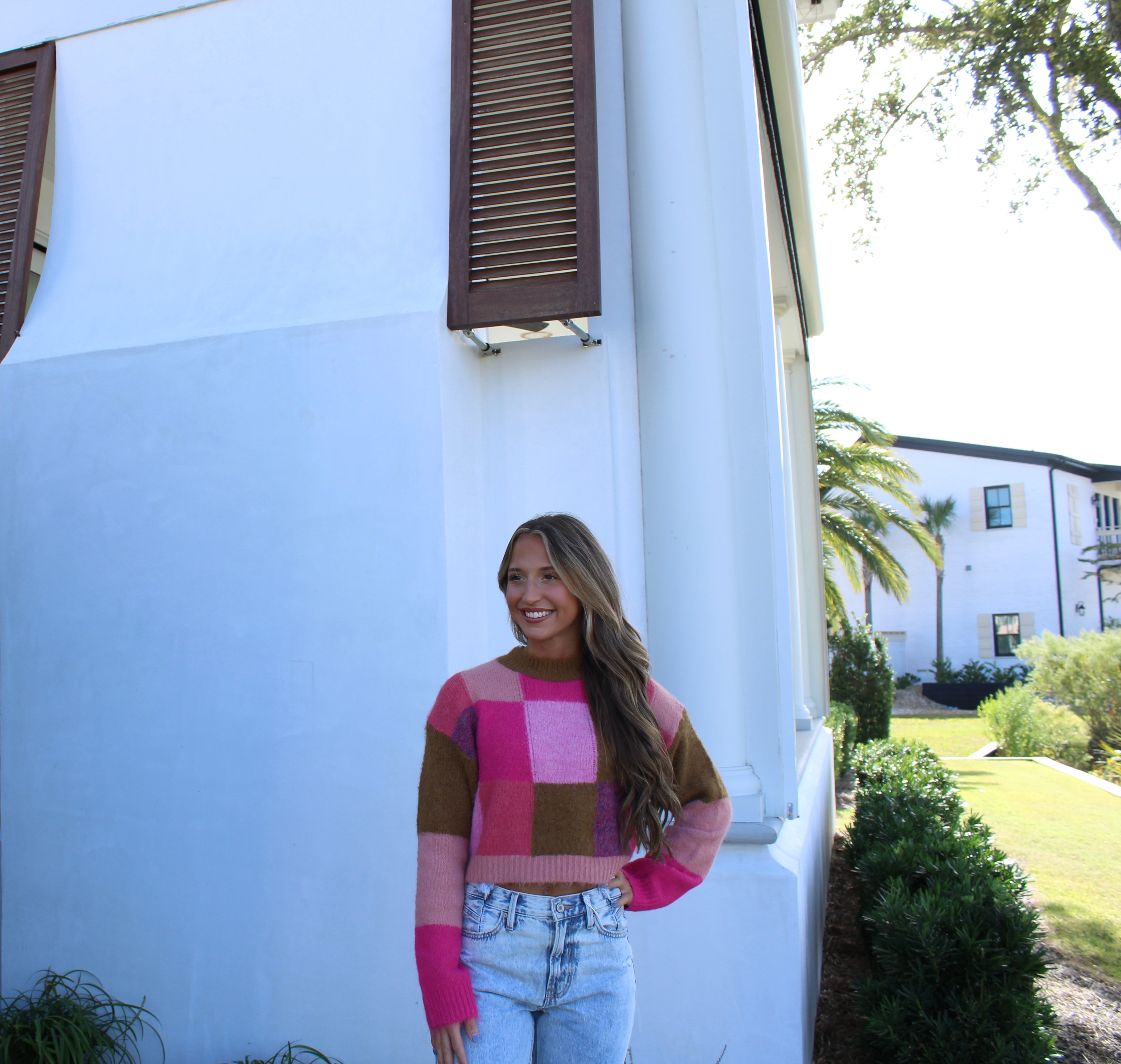 • This slightly cropped sweater top features a round neck line with the perfect brown/ pink fall color block duo!